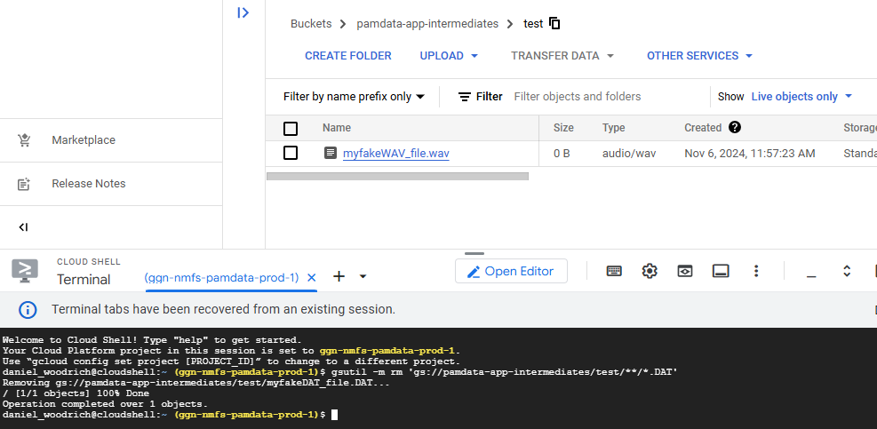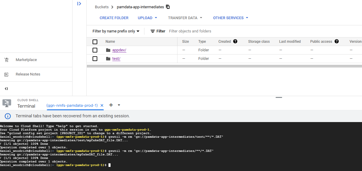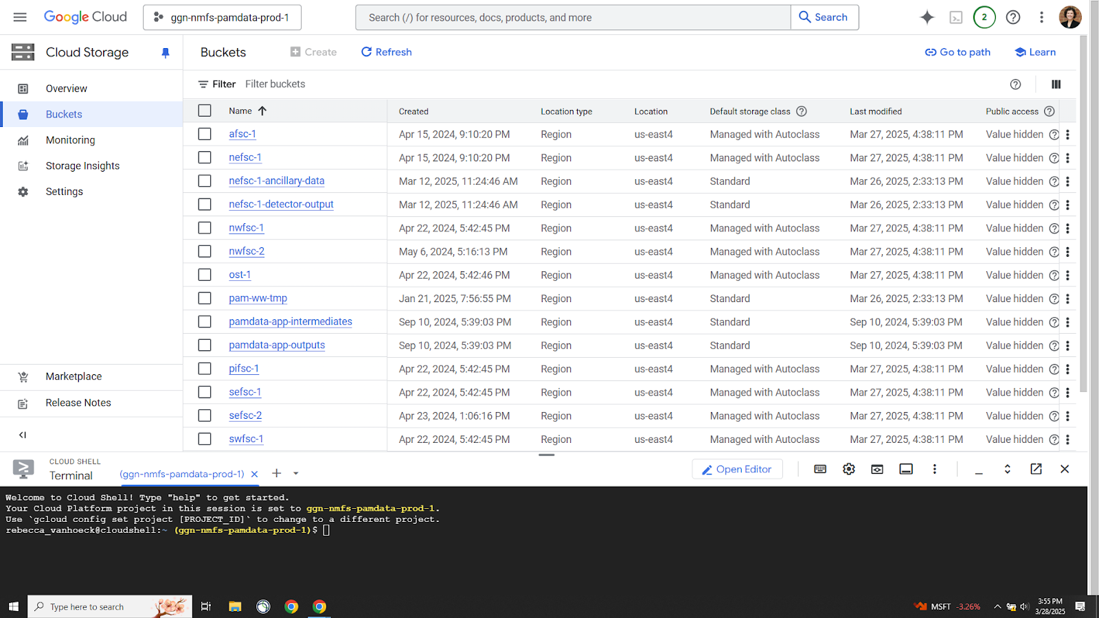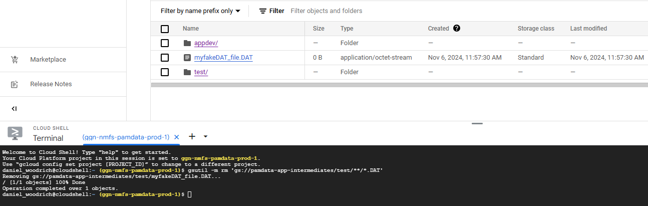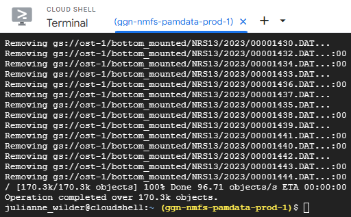 To rename or delete large batches of files, use the Google Cloud Shell terminal at the bottom of your browser window when you are on the NMFS GCP. Using the Cloud Shell terminal will keep traffic off of your network.