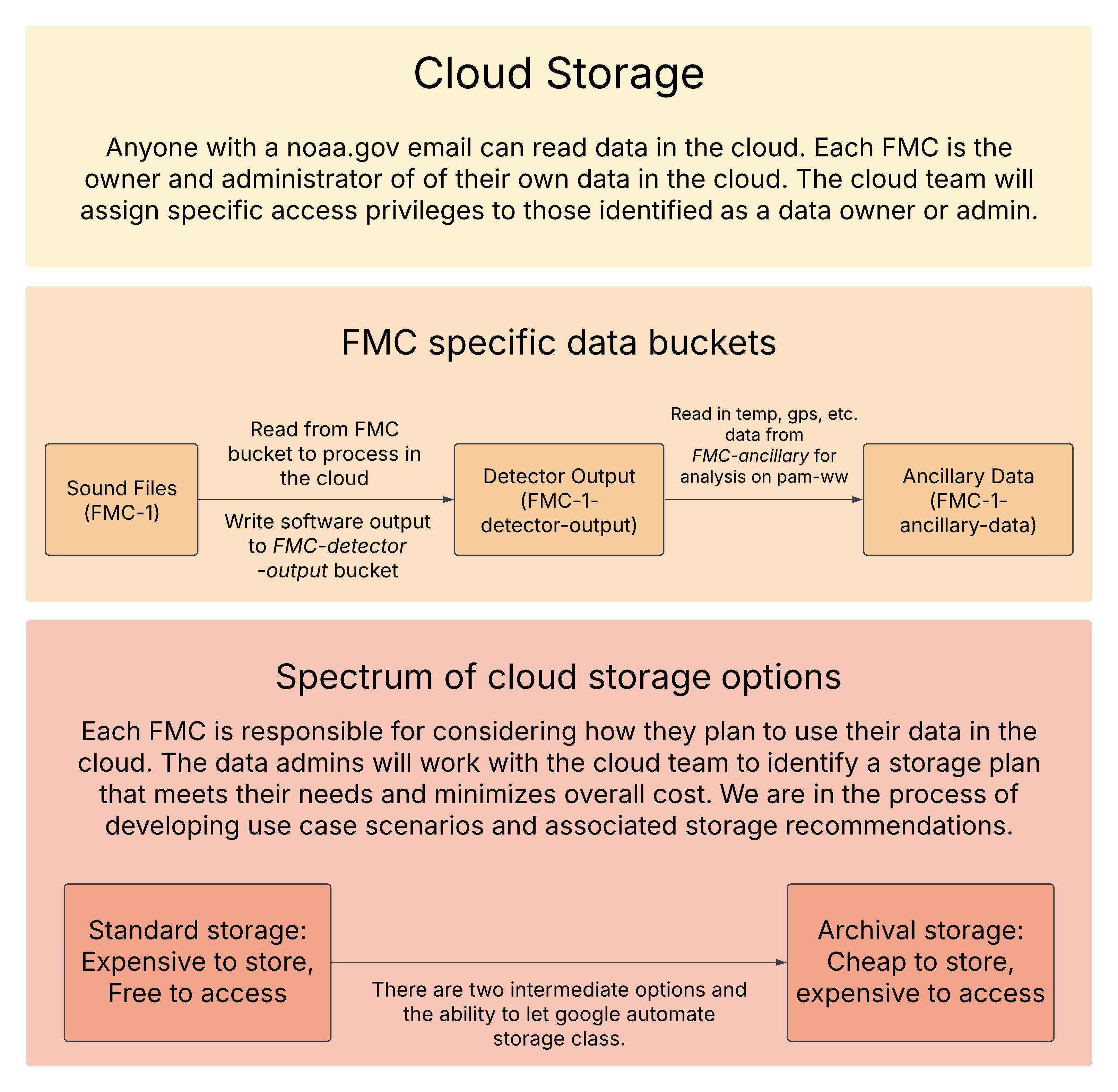 View and interact with cloud data through the National PAM Google Cloud Console(PAM GCP). Anyone with a noaa.gov email can read data in the PAM GCP. Each FMC will assign their own data owner and administrator for their cloud buckets. These roles come with their own unique access permissions. To view or edit who has read/write/delete permissions to your FMC data bucket visit this spreadsheet. The cloud developer (Dan Woodrich) will receive an automated email indicating that the spreadsheet has been updated and make the according changed. See suggested data organization structures here. This google document will be updated as we develop the National PAM GCP and each FMC becomes cloud operational.
