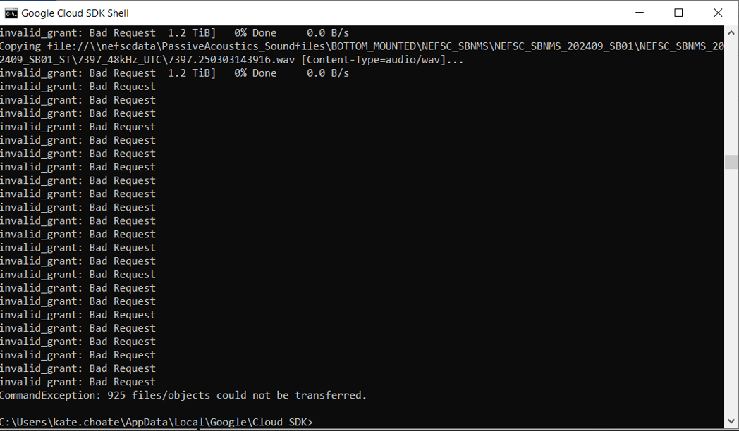 gsutil -m cp -r //nefscdata/PassiveAcoustics_Soundfiles/BOTTOM_MOUNTED/NEFSC_MA-RI/NEFSC_MA-RI_202011_COX02/NEFSC_MA-RI_202011_COX02_ST/5444_48kHz_UTC/ gs://nefsc-1/bottom_mounted/NEFSC_MA-RI/NEFSC_MA-RI_202011_COX02/NEFSC_MA-RI_202011_COX02_ST/Note: For the example above, if you have already made an NEFSC_MA-RI_202011_COX02_ST subfolder in the GCP, then this may create two duplicate subfolders (i.e., NEFSC_MA-RI_202011_COX02_ST/NEFSC_MA-RI_202011_COX02_ST). One workaround is to temporarily rename the 5444_48kHz_UTC folder on the server as NEFSC_MA-RI_202011_COX02_ST and then try uploading to the GCP. You can make a temporary folder titled “extra 5444_48kHz_UTC” in the deployment folder so you save the original file name and use it to rename the folder when the upload is complete.