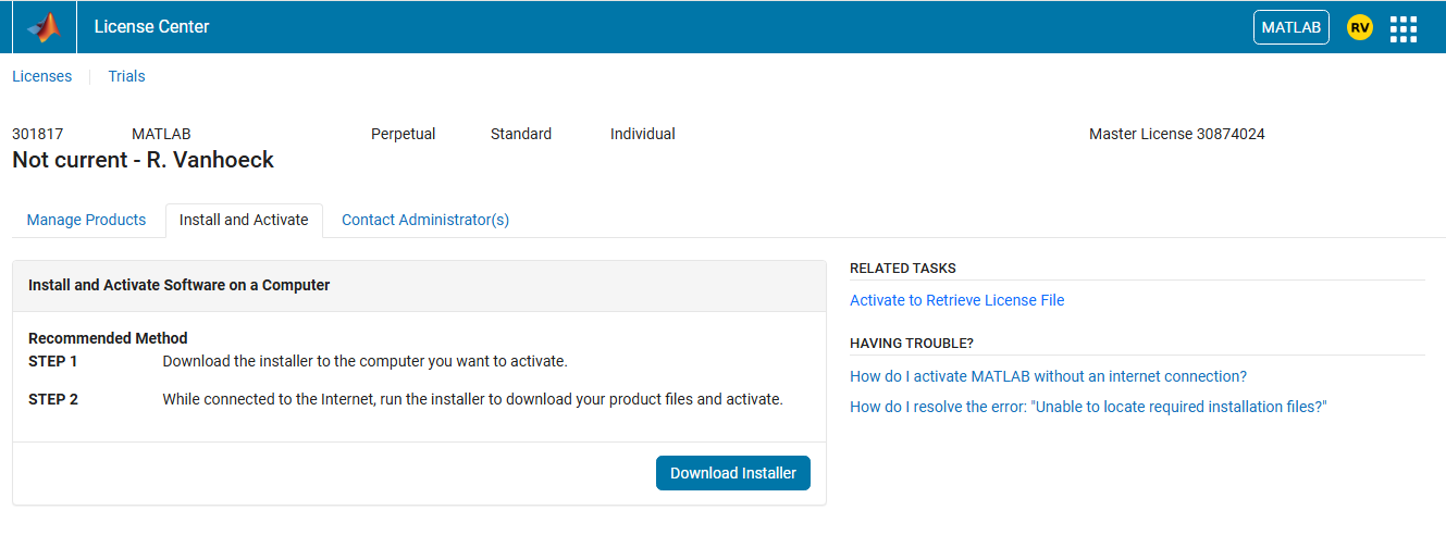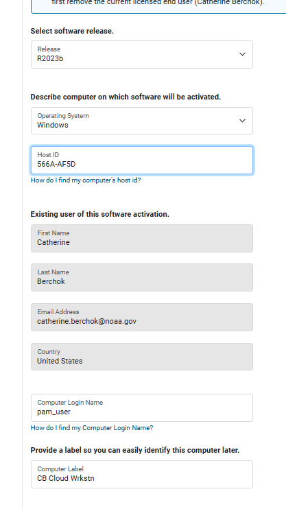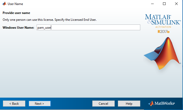 Once online with the admin, open the installer. Provide the requested fields. The installation process varies slightly for each version of Matlab. A few possibility are shown below. If prompted for the username that will be associated with the license, ensure you specify that pam_user is the Computer login name.