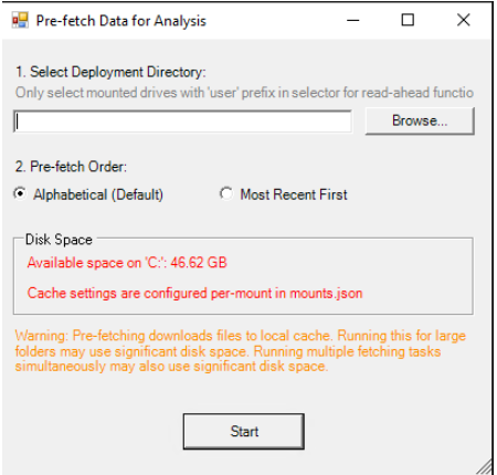 A GUI will open with the options to select a folder for caching and to select a pre-fetch order (alphabetical or most recent first).This GUI also displays your available space on the C: drive (where pre-fetched files will be cached).