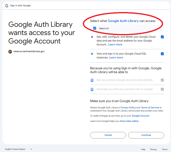 To confirm authentication was successful, enter ‘gcloud auth list’ in the terminal and check that it returns your NOAA email address.