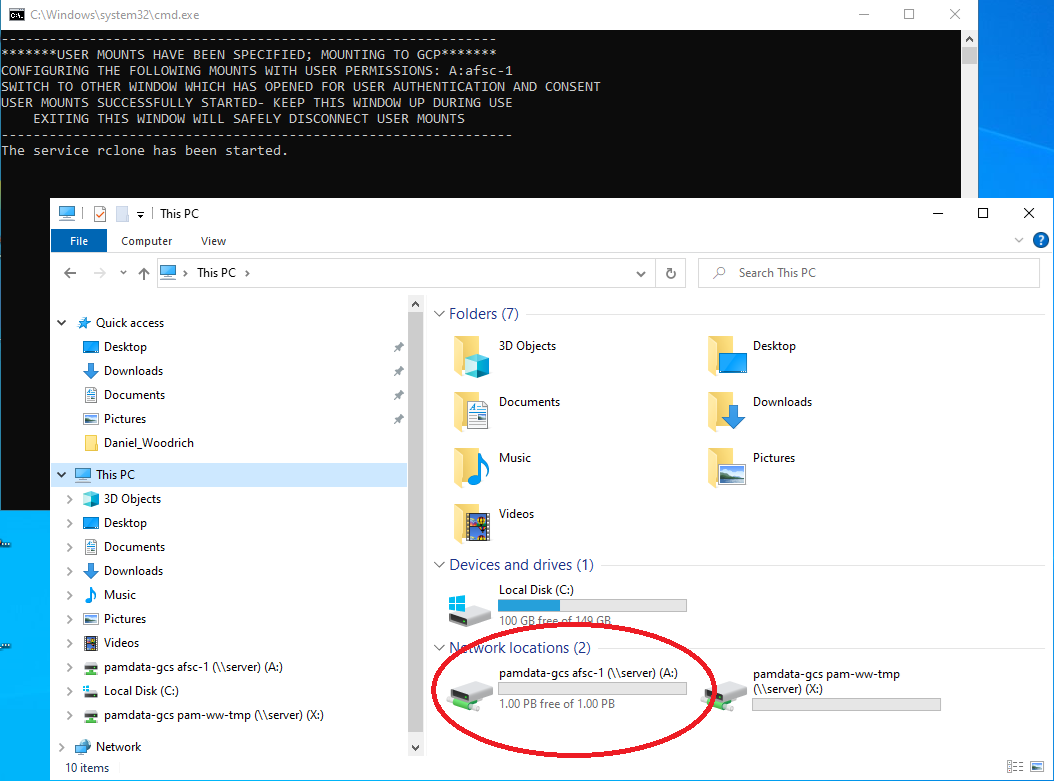 - If successful, you will see a success message in the cmd window. You will also see in Windows Explorer that new drive mounts are now available. Keep this window running as long as you would like the user mounts to be running, and if you accidentally close, you can run the ‘start_user_mounts.bat’ file again to launch the user mounts.