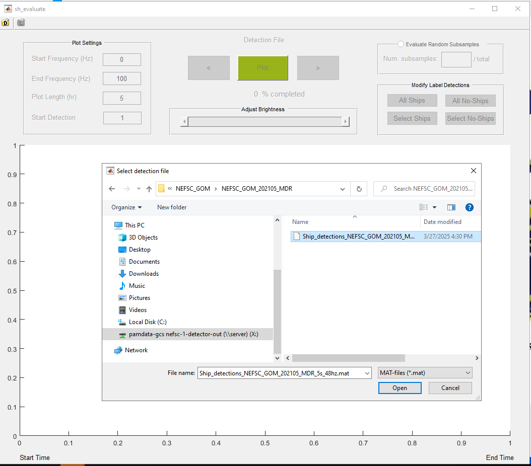 - Select the yellow folder with a ‘D’ in the upper left corner then navigate to and open the detector output through the mounted Z: drive. The path to the output is: Z:\MATLAB_VESSEL_FIXED\RAW\NEFSC_GOM\NEFSC_GOM_202105_MDR\