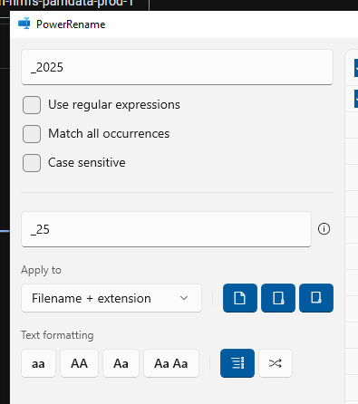 In the PowerRename window, fill in the four digit year to the ‘Search for’ box and the two digit year in the ‘Replace with’ box