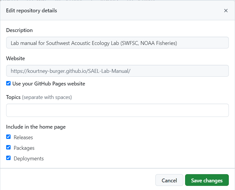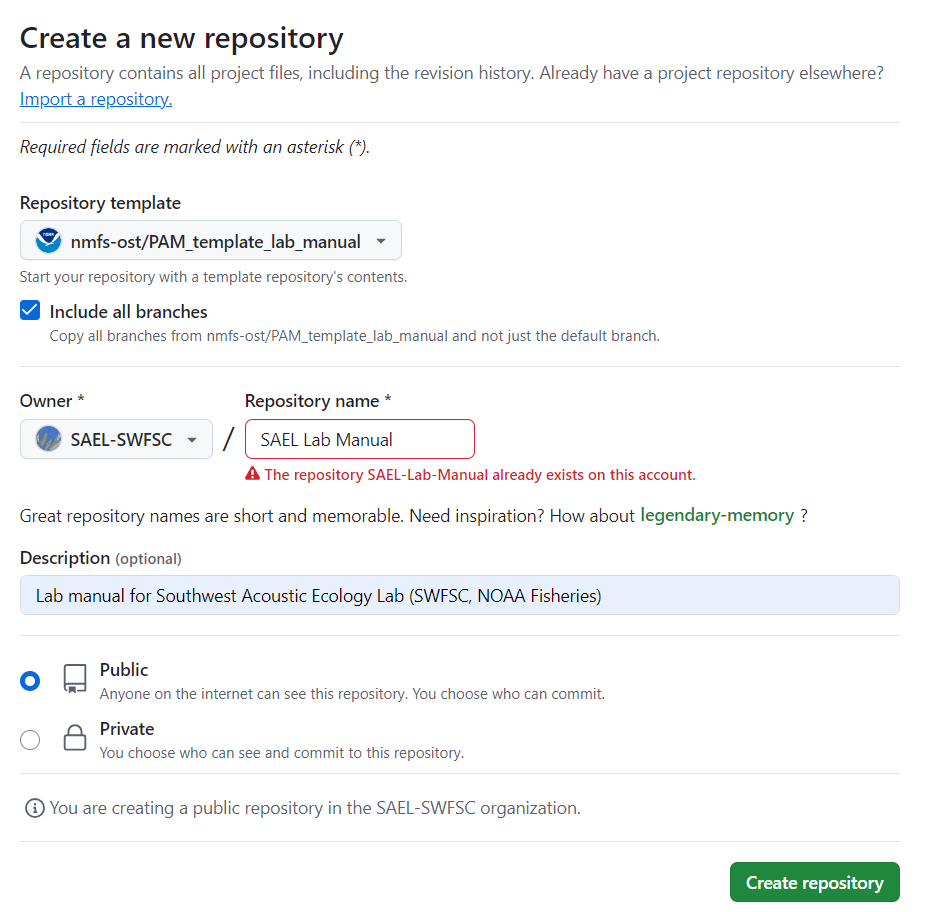 Select your lab organization or yourself as the owner and set the repository name to ‘Lab name Lab Manual’