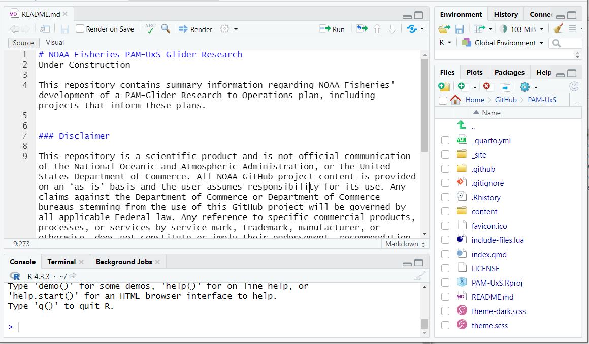 In the lower right section of RStudio, select ‘Files’ and you will see the README.md file, which appears on the home page on your Github repository site.