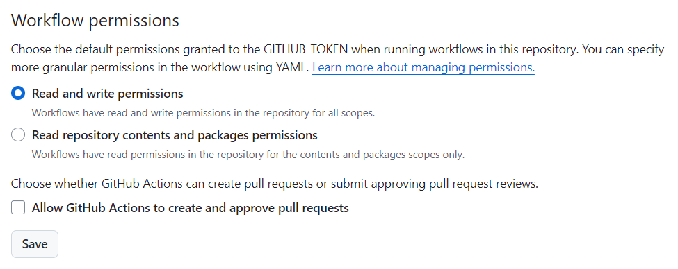Under Settings -> Actions -> General -> Workflow permissions select ‘Read and write permissions’