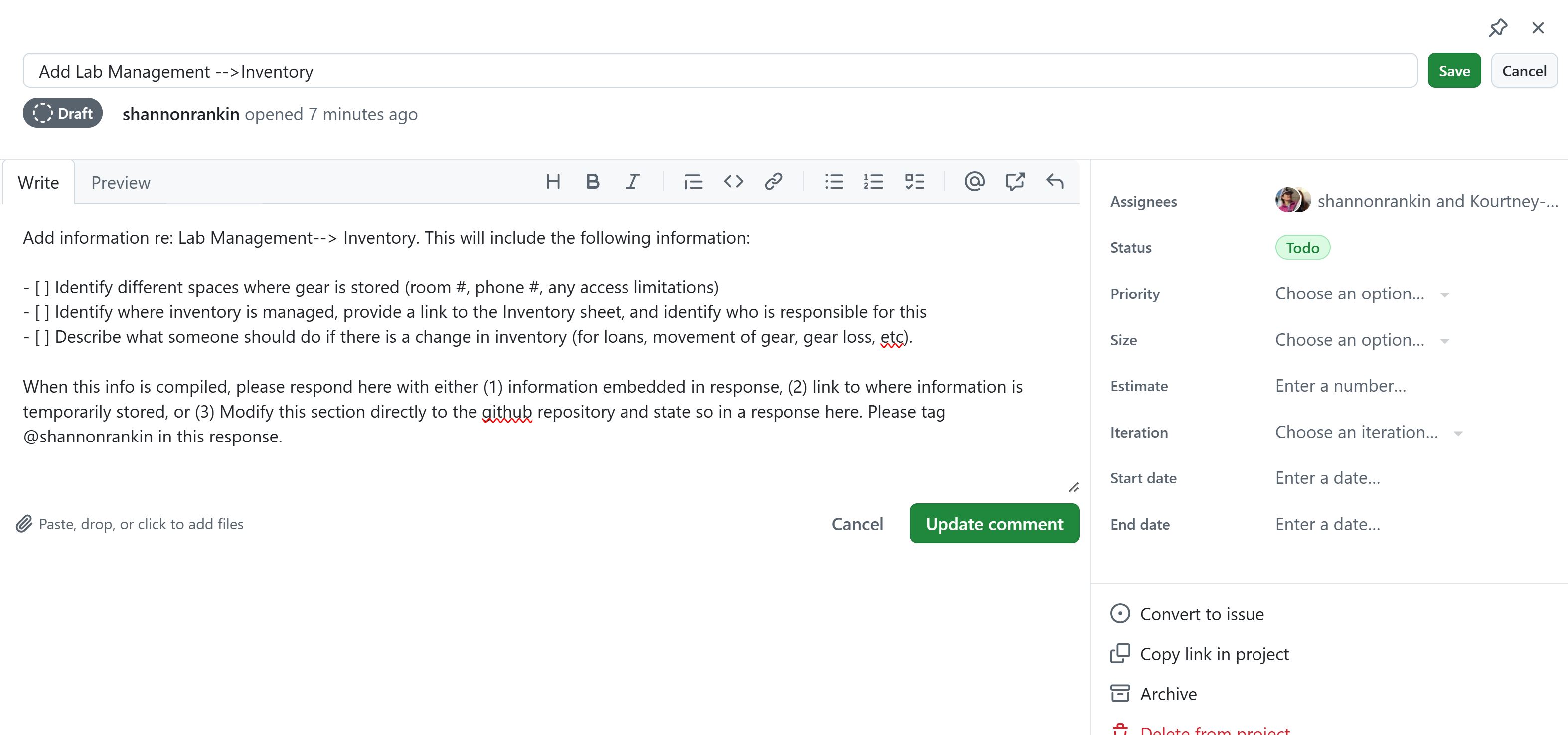 - Edit on the new card you made by clicking on the name within the card. Click on “Edit”, and add information related to this issue (including any instructions as to the info you want to add, how it should be added, etc). When you are done, click “Update Comment”.Identify Assignees (on the right). Then select “Convert to Issue” at the bottom right. Choose the appropriate repository to link the Project page to (your Lab Manual).