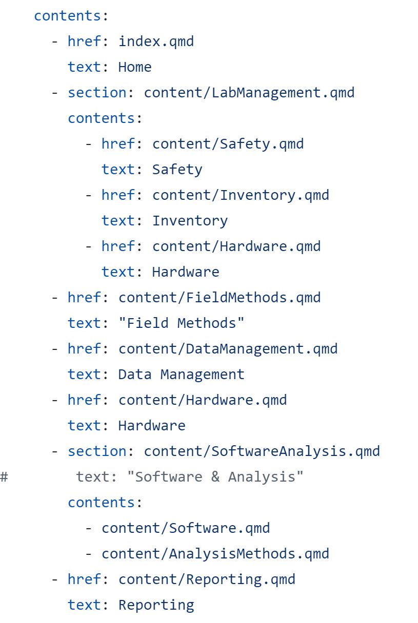 Quarto Books are combinations of multiple documents (chapters) into a single manuscript in one or more formats (HTML, PDF, Word Doc, etc). Our example below is based on the PAM_template_lab_manual: