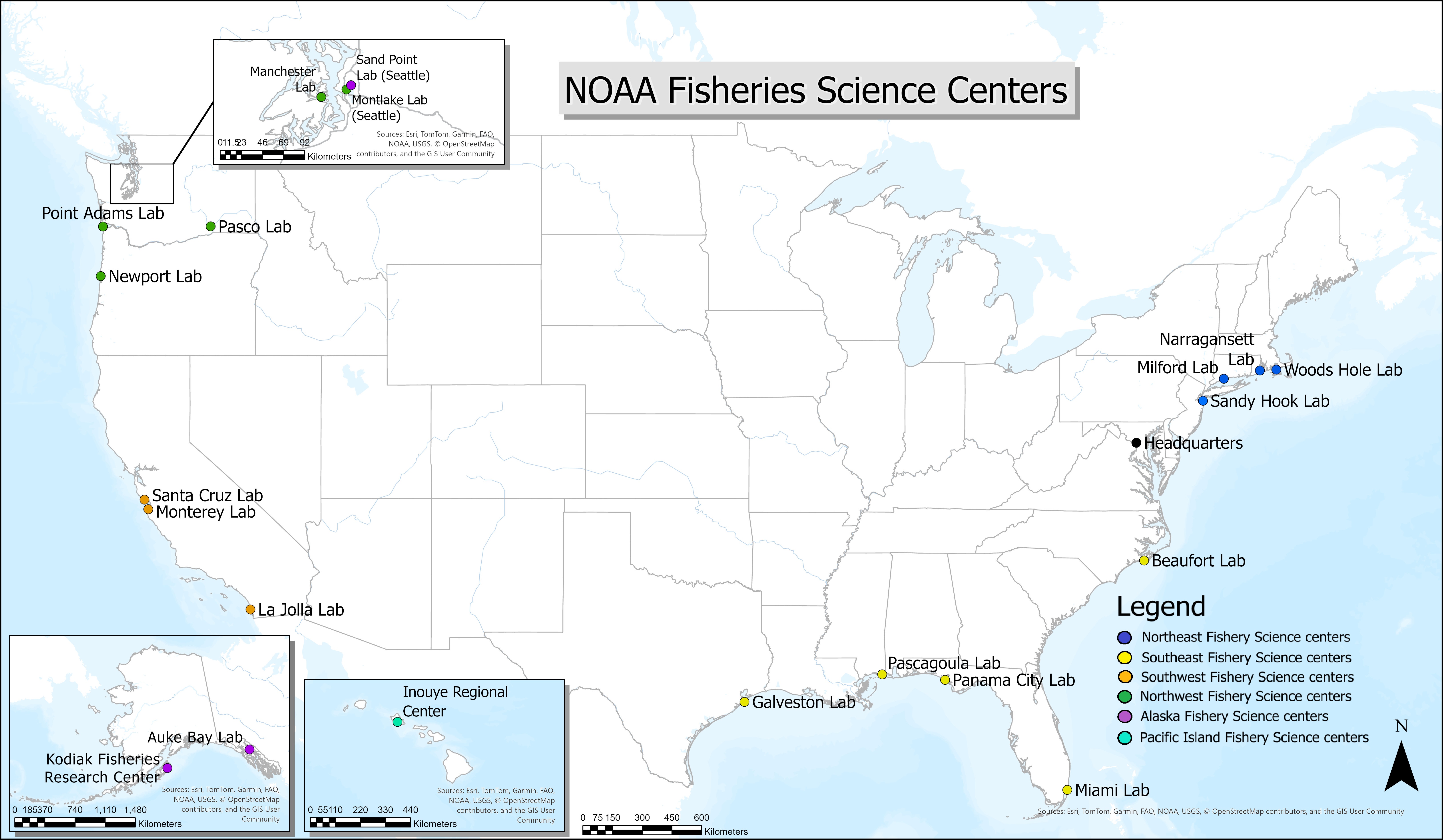 Map of Regional Fishery Science Center Labs. Regions are designated by color (see legend) with each region’s primary science center indicated by square symbols.