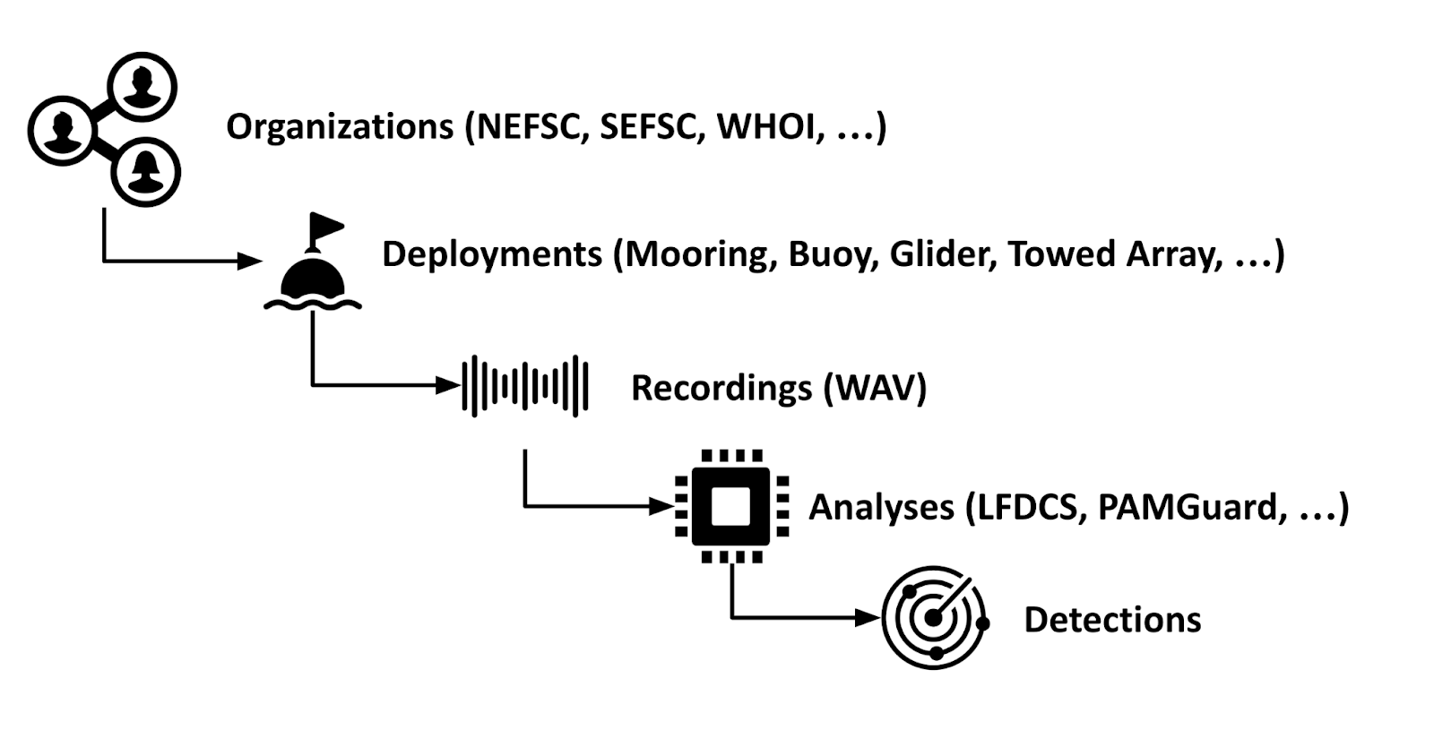 Anyone producing PAM data products will be invited to contribute their data to the Markara database by submitting deployment metadata and detection data online through the associated data portal. Subject to data owner permission, data stored in the Makara database will be displayed on the PACM web application, and made publicly available for use through the North Atlantic Right Whale Consortium’s (NARWC) formal data request.