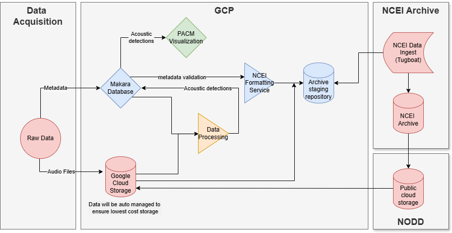 The NCEI Passive Acoustic Data Archive serves as the most robust repository of publicly available passive acoustic data. Due to complex metadata and the large data volume associated with passive acoustic data, archiving the raw audio files can be extremely time consuming. Leveraging the standardized metadata schema provided by the Makara database and integrations with Google cloud storage, NOAA Fisheries and NCEI are collaborating on a cloud-based pipeline to streamline the process for making NOAA PAM data publicly available through NCEI. This effort will allow data owners to easily indicate within the Makara database schema which data is ready to send to the NCEI.