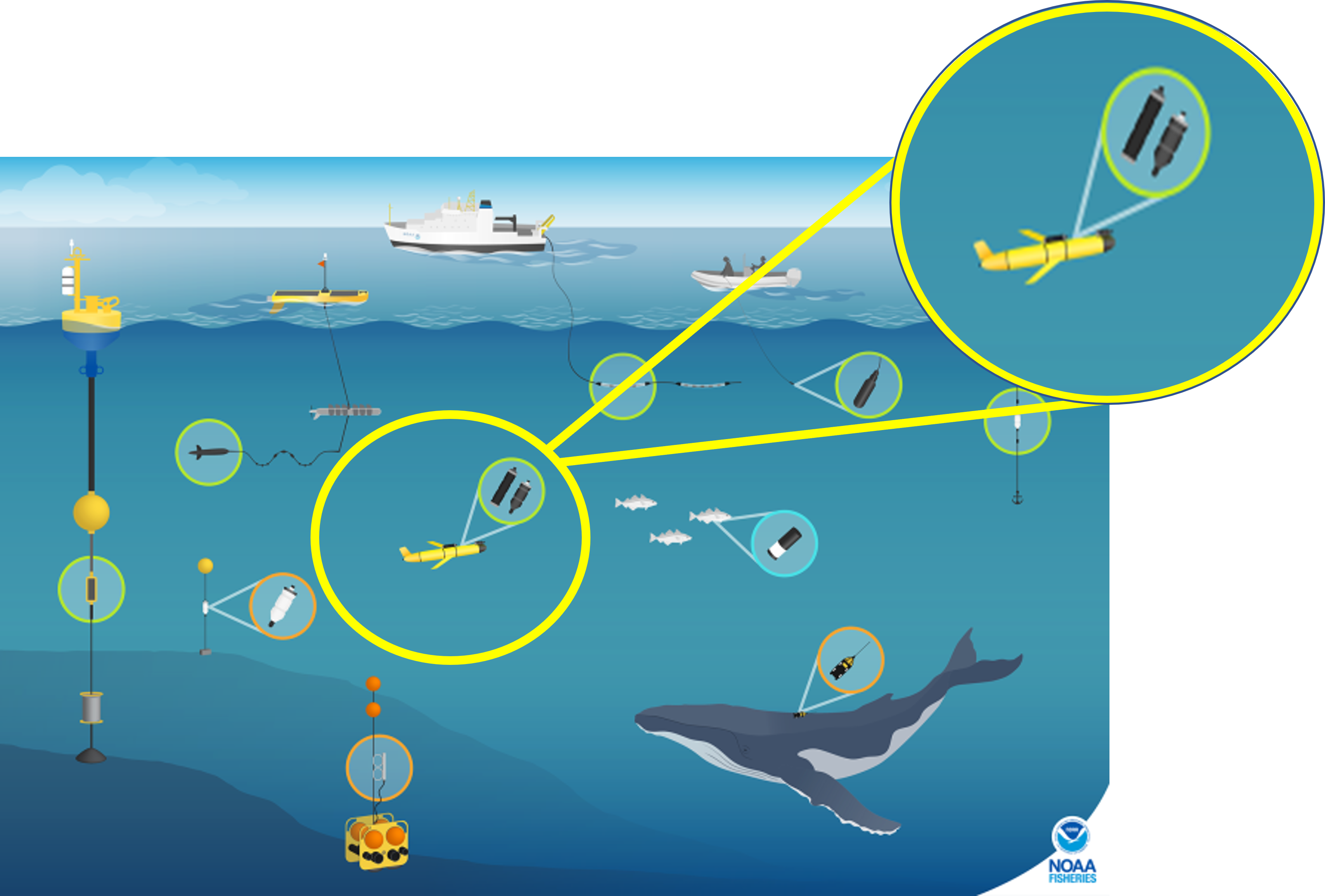 The “Plankton to Whales” (P2W) project is a collaborative project between the PAM-SI and the UxS (uncrewed systems) and Optics Strategic Initiatives. The P2W project transitions PAM-equipped gliders and Shadowgraph-equipped gliders to operational ecological surveys. P2W surveys will begin when after testing of these systems (as soon as summer 2025).
