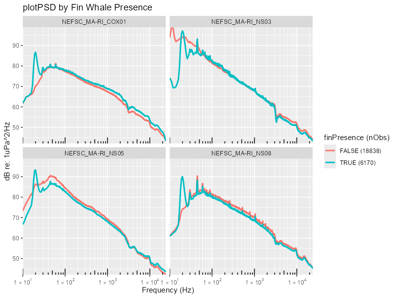 A primary goal of recent PAMverse developments is to provide a streamlined way for passive acoustic researchers to integrate data from multiple data streams into standardized, informative data products that can be used as a decision support tool. PAMverse includes multiple built in functionality to integrate relevant environmental data with acoustic detection or soundscape data as well as directly integrate soundscape data with acoustic detection information. The examples below are the initial set of figures that are currently available. We are also exploring functionality to model the relationship between acoustic presence of a sound source and environmental variables, primarily sea surface temperature, using generalized additive models. If there is a figure of interest that could be repeatedly used for your research or by others, please reach to Taiki to explore incorporating it into the package.