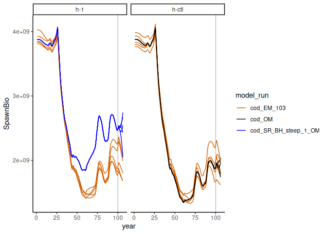 data = subset(summary$ts, model_run %in% c("cod_OM", "cod_SR_BH_steep_1_OM", "cod_EM_103")),