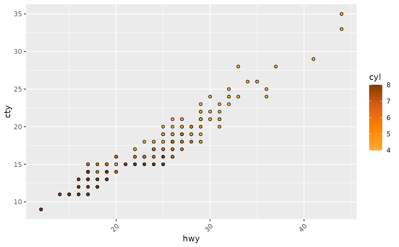 ggplot(mpg, aes(x = hwy, y = cty, fill = cyl)) +