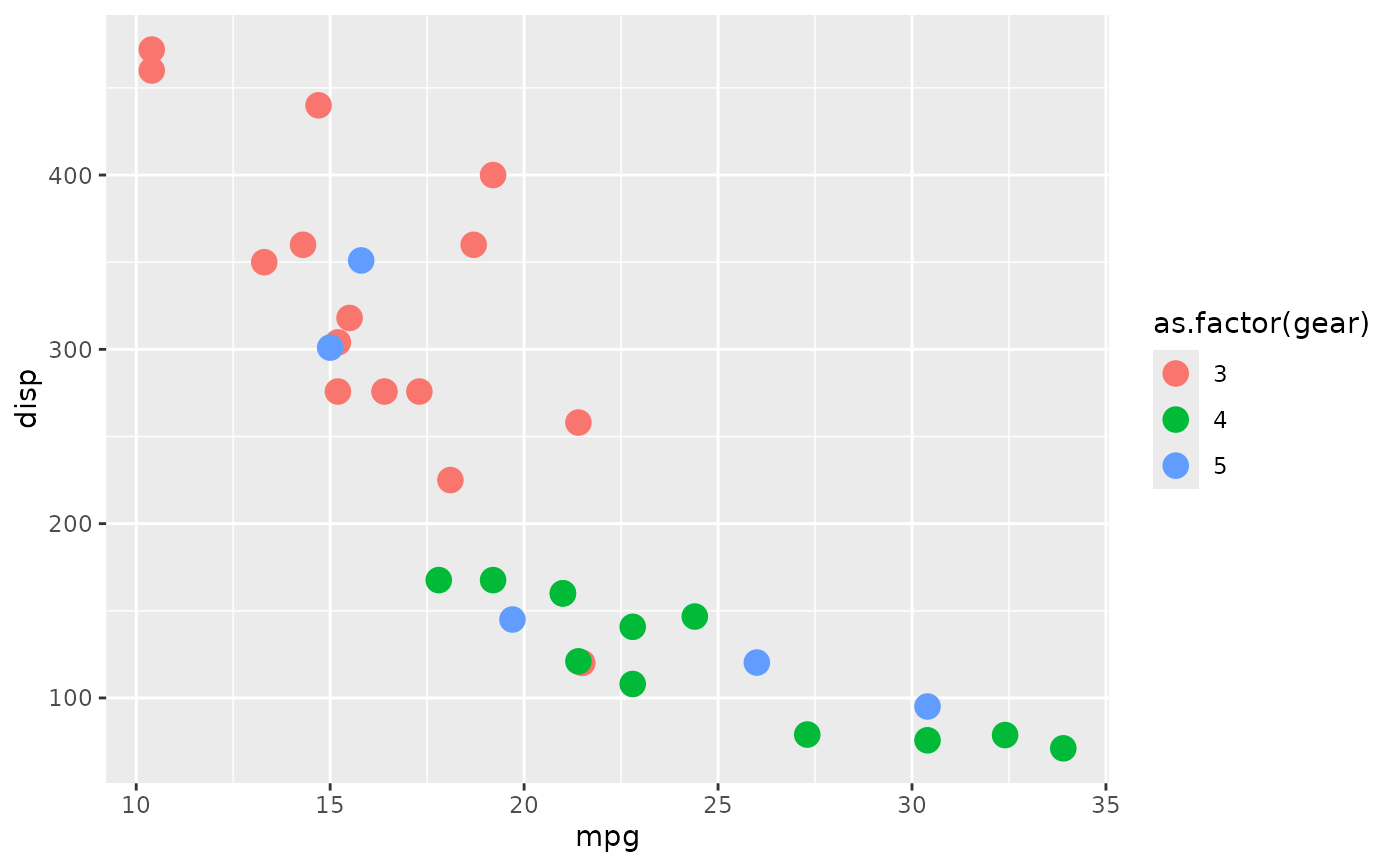 ggplot(mtcars, aes(mpg, disp, color = as.factor(gear))) +