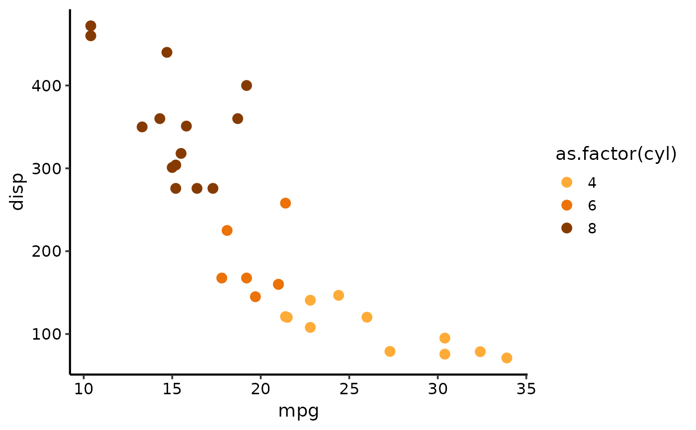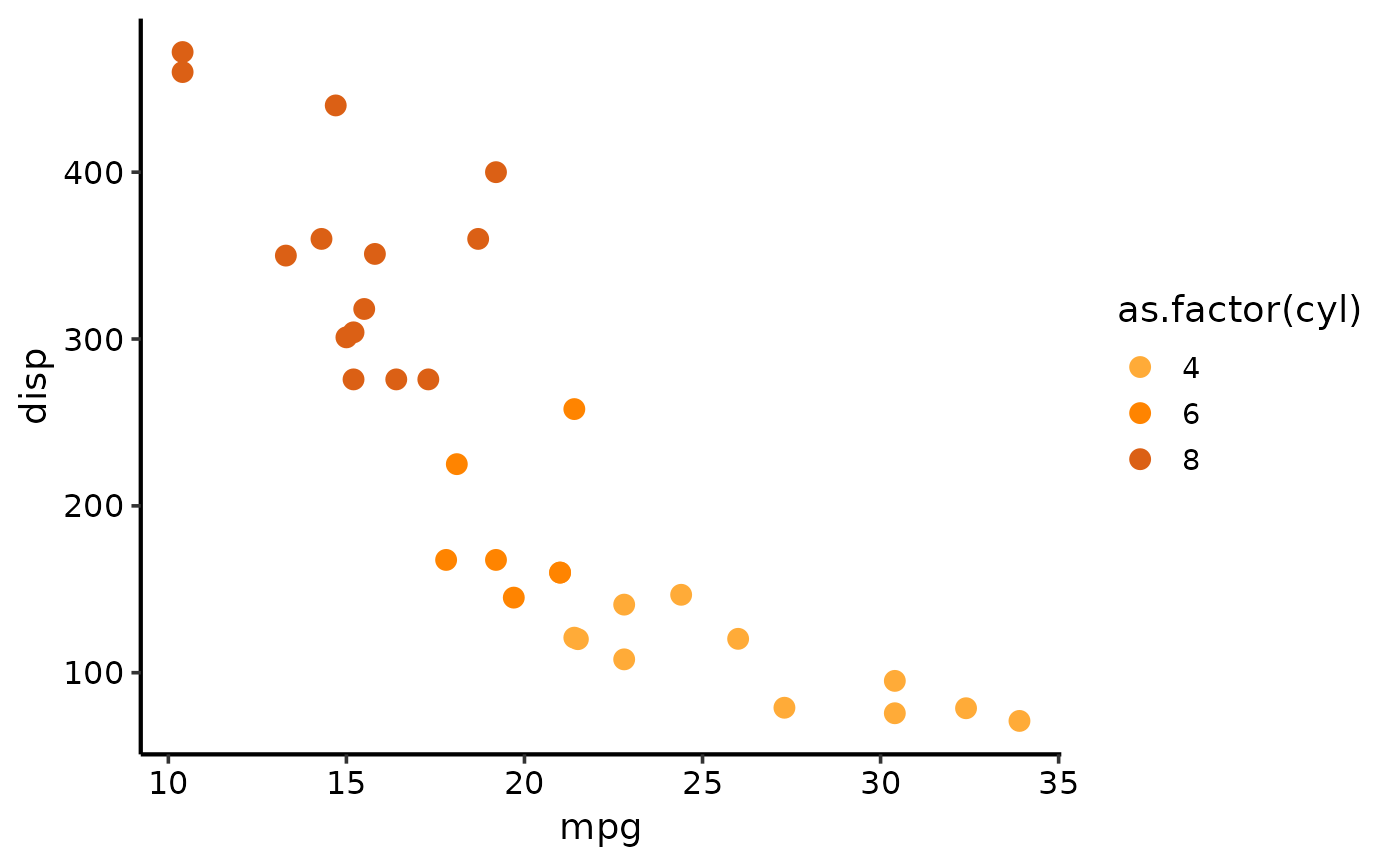 ggplot(mtcars, aes(x = mpg, y = disp, color = as.factor(cyl))) +