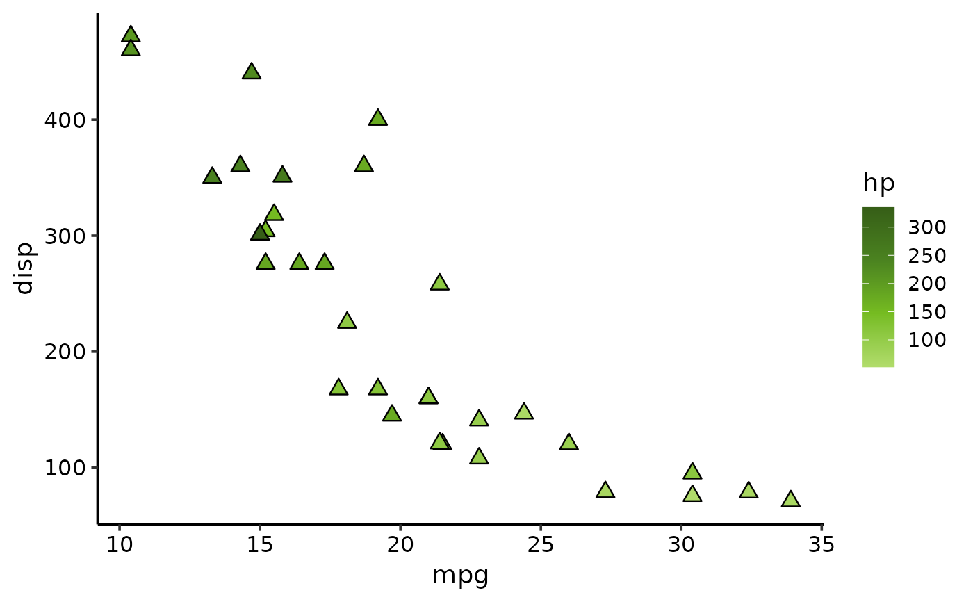 ggplot(mtcars, aes(x = mpg, y = disp, fill = hp)) +