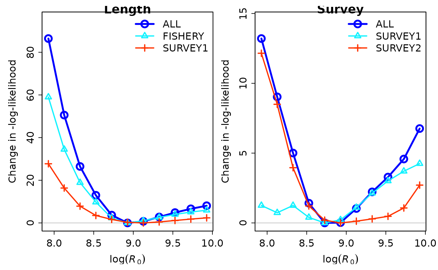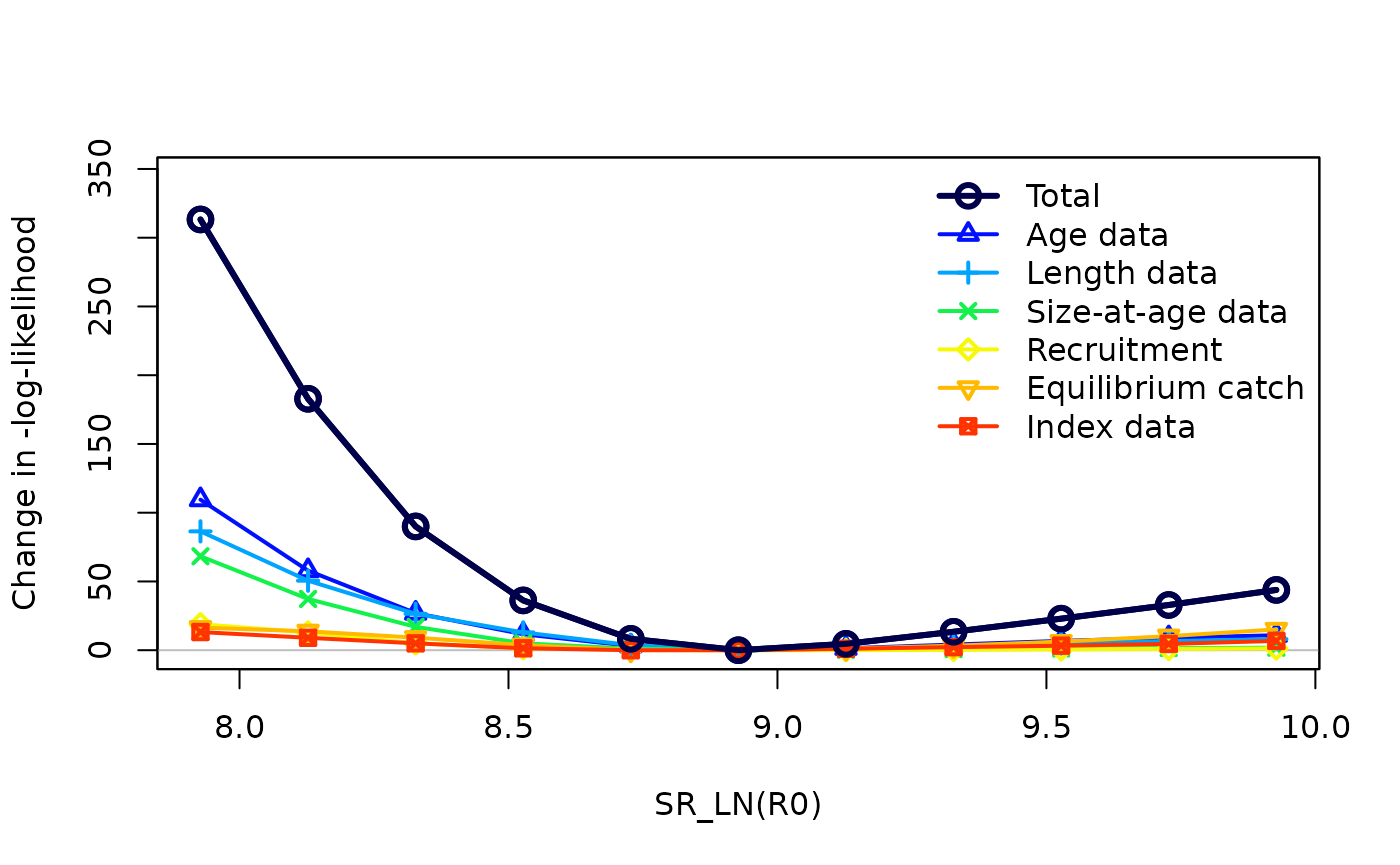 Likelihood profiling is a key model diagnostic that helps identify the influence of information sources on model estimates. The number of recruits in an unfished population (R0) is a commonly profiled parameter since it dictates the absolute size of a fish population (serves as global scaling parameter). To conduct a profile, values of the parameter over a given range are fixed and the model re-run and then changes in total likelihood and data-component likelihoods are examined. It is recommended to run this throughout the development process, particularly after incorporating new data sets to understand how informative each component is on the estimation of R0 and if there is conflict between data sources.