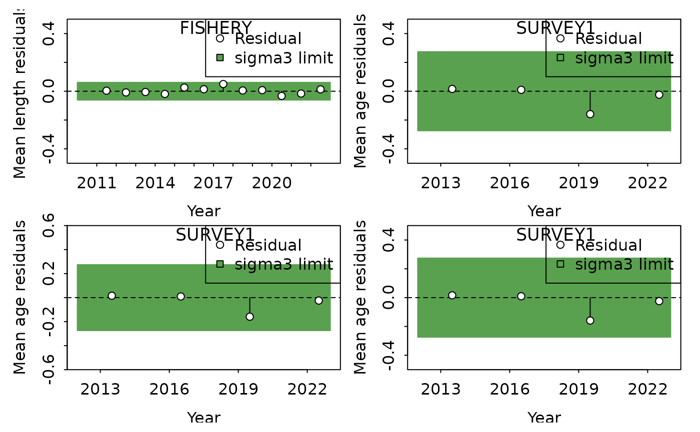 The runs test is a nonparametric hypothesis test for randomness in a data sequence that calculates the 2-sided p-value to estimate the number of runs (i.e., sequences of values of the same sign) above and below a reference value. The runs test can diagnose model misspecification using residuals from fits to index and composition data (Carvalho et al. 2017) by testing if there are non-random patterns in the residuals. In addition, the three-sigma limits can be considered useful for identifying potential outliers as any data point further than three standard deviations away from the expected residual process average would be unlikely given a random process error in the observed residual distribution.