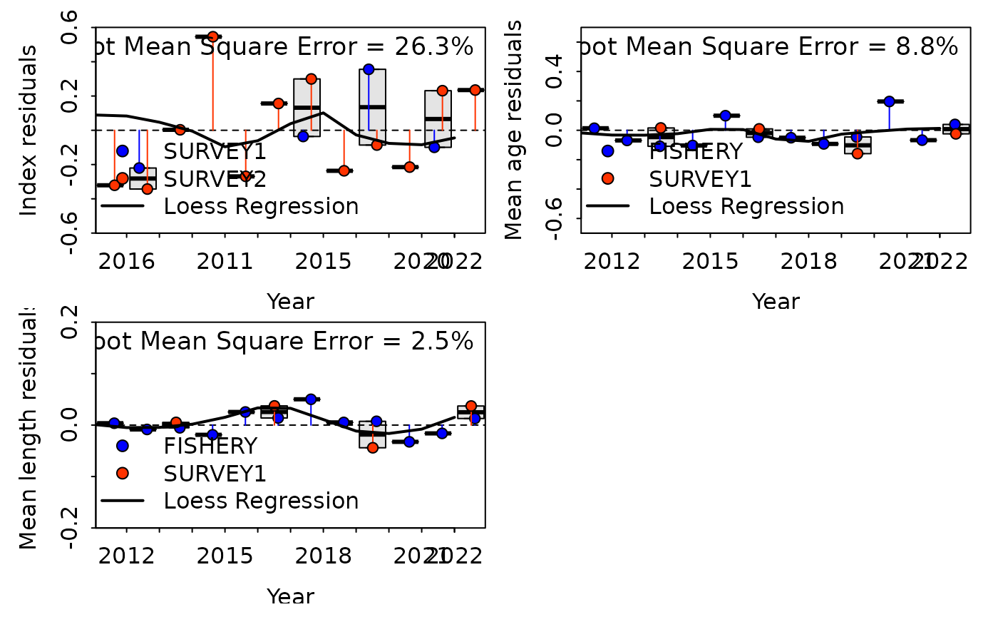 In the plots above, each point represents the difference between the observed and expected value (residual) and is color-coded to correspond to a specific fleet. The solid, color-coded vertical lines from the horizontal dashed line (at y = 0) show the distance between 0 and the residual value. Box plots summarize the spread of residual values across all fleets within each year and the thick solid black line is a loess smoother fit through all residual points. Total RMSE is displayed in the top right corner. When assessing this plot, it is important to see if there are any patterns or trends in the residuals, how large the overall RMSE is, and whether the data from different fleets generally agrees or conflicts with each other.