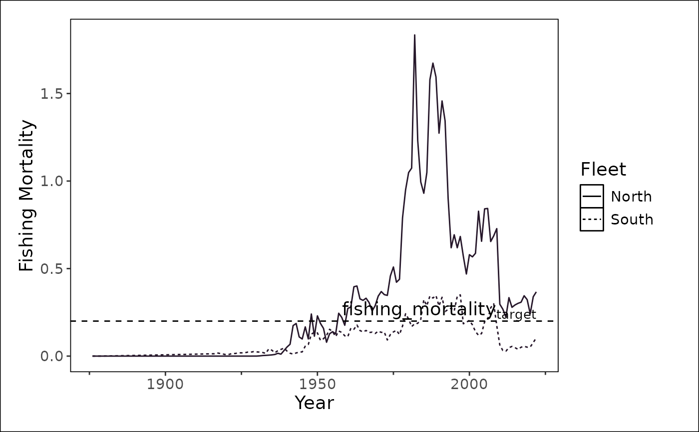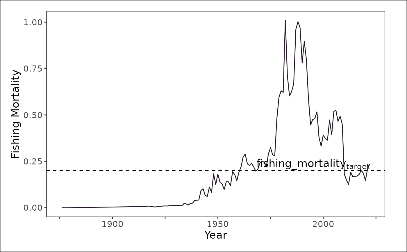 A string specifying the type of reference you want to compare spawning biomass to. The default is `"target"`, which looks for `"spawning_biomass_target"` in the `"label"` column of `dat`. The actual searching in `dat` is case agnostic and will work with either upper- or lower-case letters but you must use one of the options specified in the default list to ensure that the label on the figure looks correct regardless of how it is specified in `dat`.