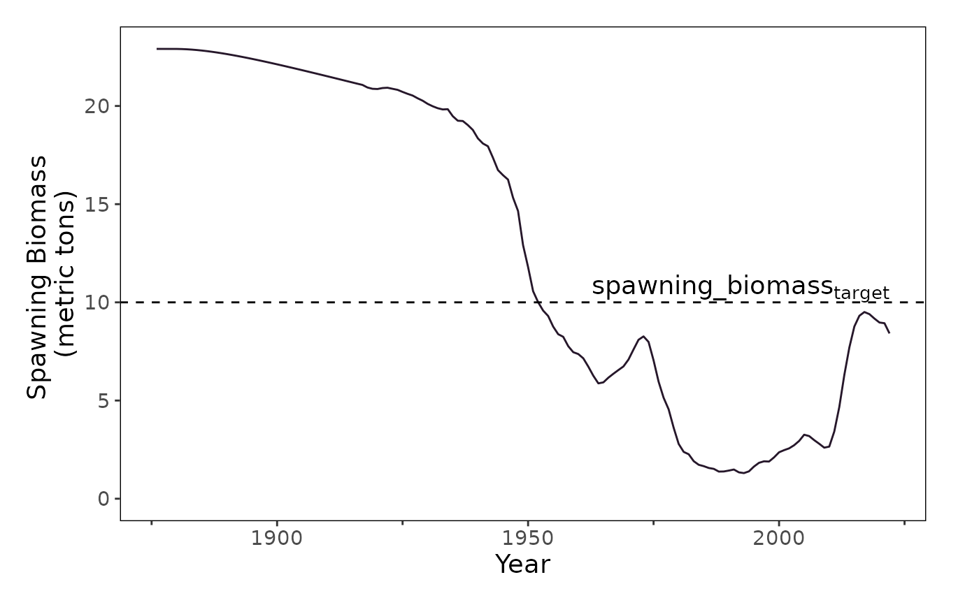Plot spawning biomass with a reference line as a dashed line. The figure can also be made relative to this reference line rather than in absolute units.