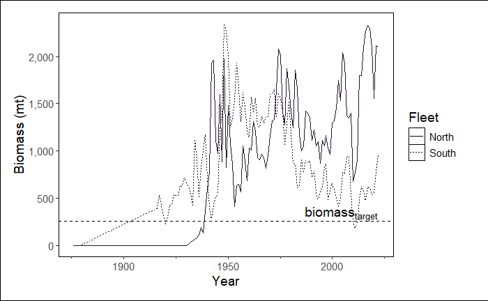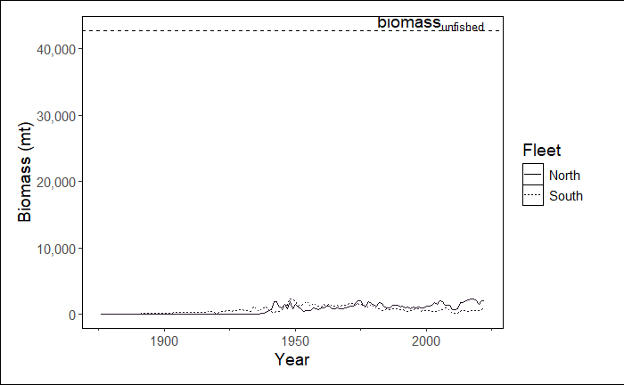 Run the example below. It should result in a line graph showing biomass over time, including a reference line for the biomass unfished.