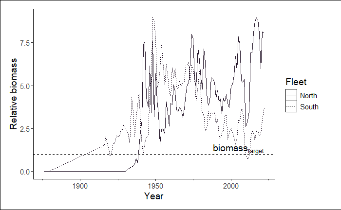 In this example, we still are bypassing module selection and we are automatically extracting the reference line value from the data. However, now we are using this reference value to plot relative biomass and changing the linewidth to 2 (an argument inherited from ggplot2).
